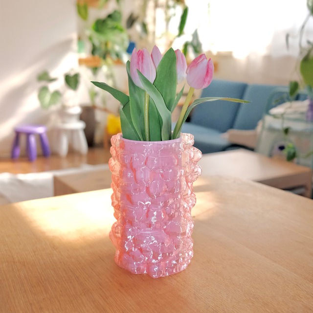 雲のような、やわらかな表情をまとった花瓶です。 透明感のある外側のパーツが光を受けてやさしくきらめき、内側のカラーシリンダーと重なることで不思議で楽しい景色をつくります。 外側の“テクスチャーパーツ”と、 内側の“カラーシリンダー”の 2つのパーツ構造。 日常のブーケもきれいに見えるように設計しました。 お部屋の光の入り方によって表情が変わるので、 朝・昼・夕方でまったく違う雰囲気を楽しめます。 窓辺やダイニングテーブルに置くだけで、 ふわっと空気を明るくしてくれる花瓶です。 サイズ 内寸:80mm (内側シリンダー部分) 高さ : 180mm 材質:内側 PLA 外側 PETG 構造:外側テクスチャーパーツ+内側シリンダーの2層構造 --- 使い方 ・そのまま水を入れて花を飾れます ・内側パーツが花を支えるので、茎が広がりにくく扱いやすいです ・外側パーツは光を拾いやすい素材のため、明るい場所に置くと透明感が際立ちます --- 一点ずつ3Dプリンターで制作しているため、 積層痕や小さな揺らぎが表面に現れることがあります。 素材の特性としてお楽しみください。 --- Moln(モルン)という名前について スウェーデン語で “雲” を意味する Moln。 ふわっとした形と、光の中でとけるような透明感から名づけました。