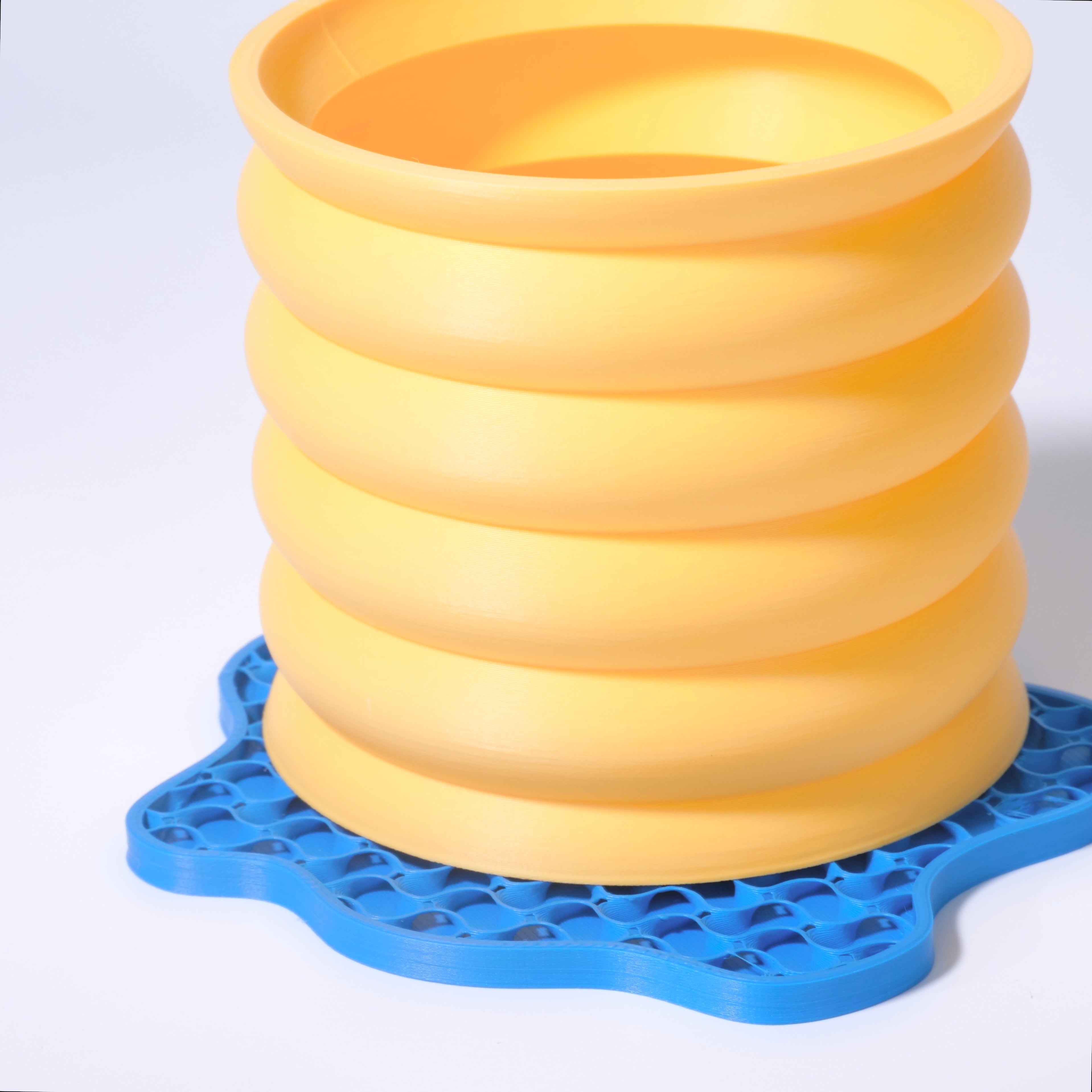 kurva イエロー。3Dプリンター製の植木鉢と水たまりをイメージした受け皿のセットです。受け皿は網目状のジャロイド構造になっており通気性と排水性を高めています。
