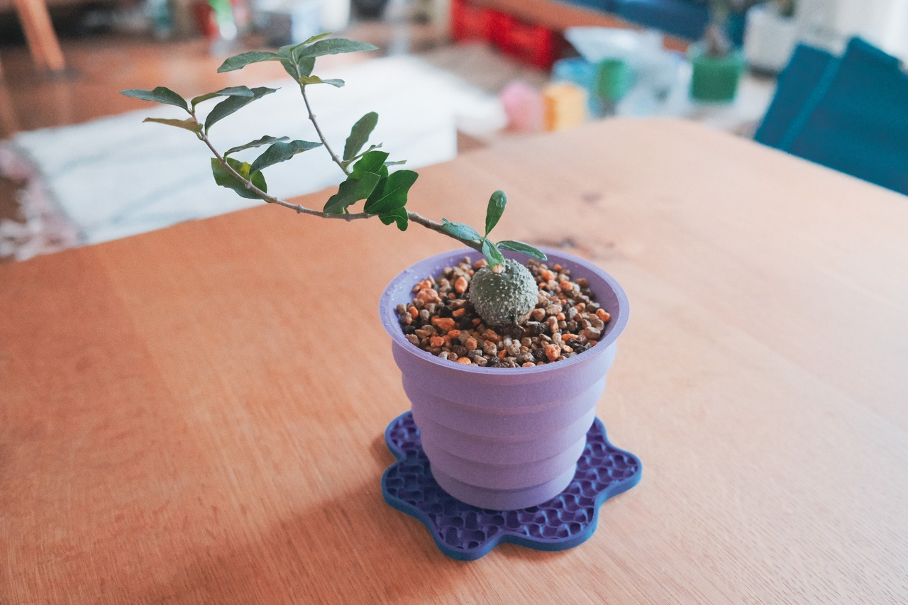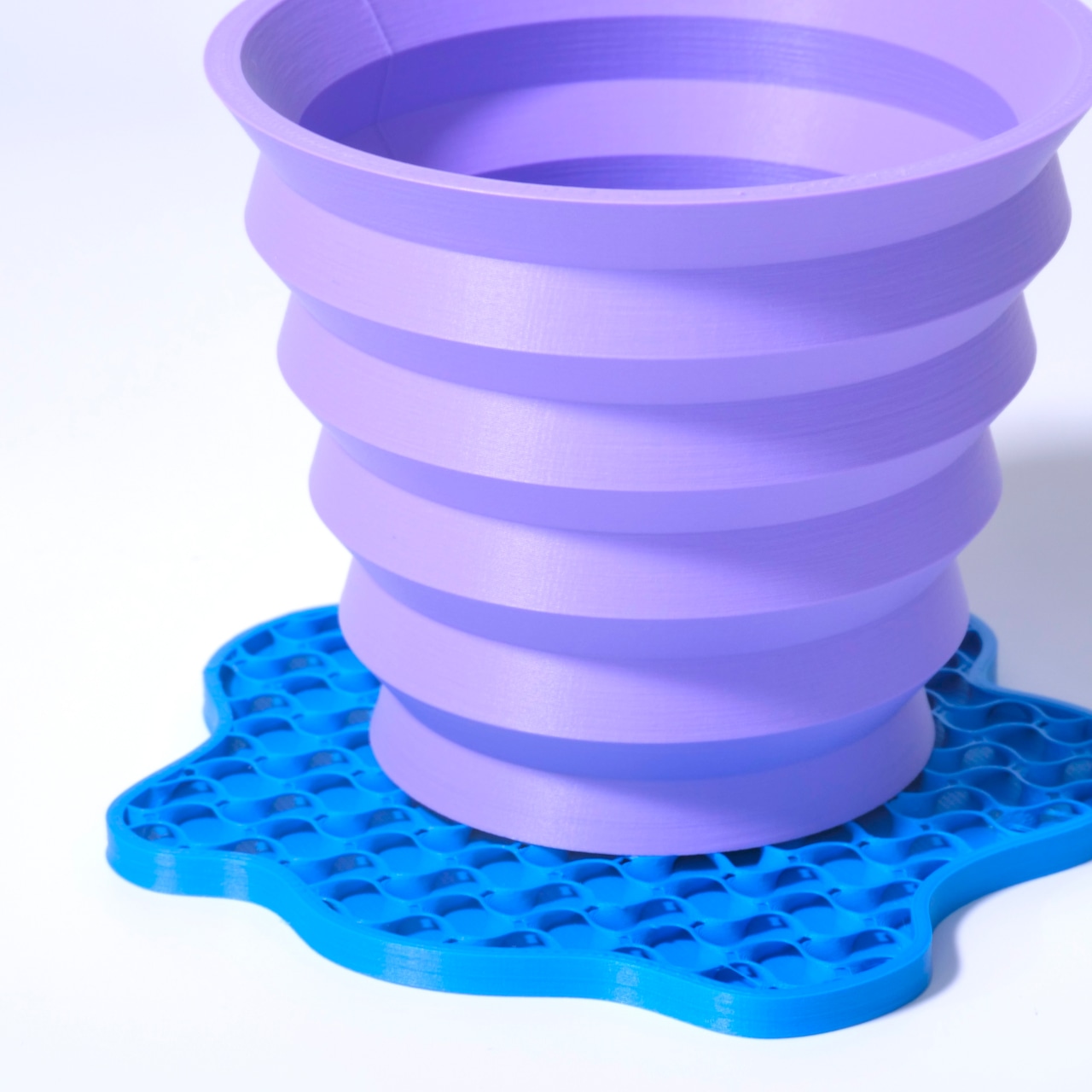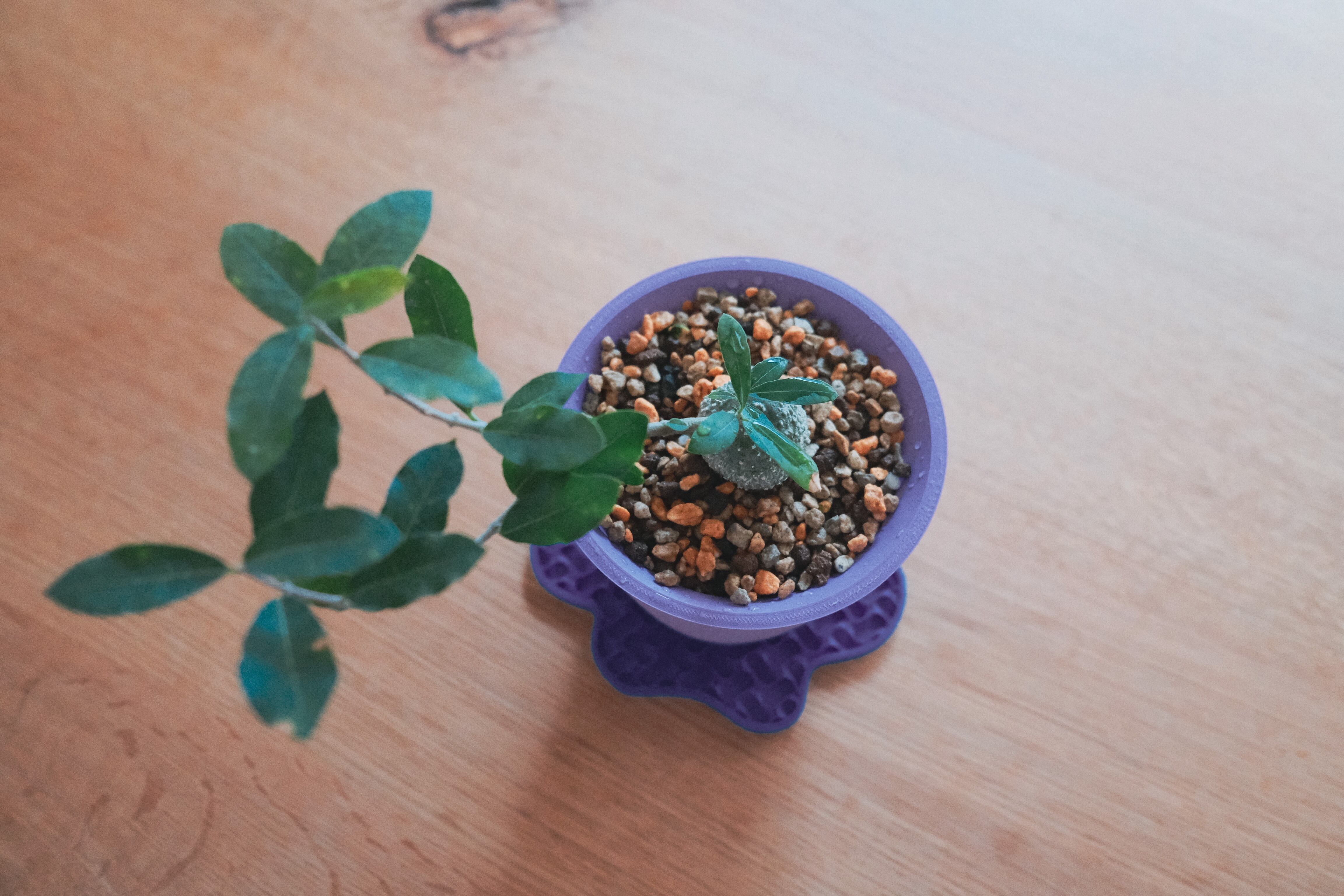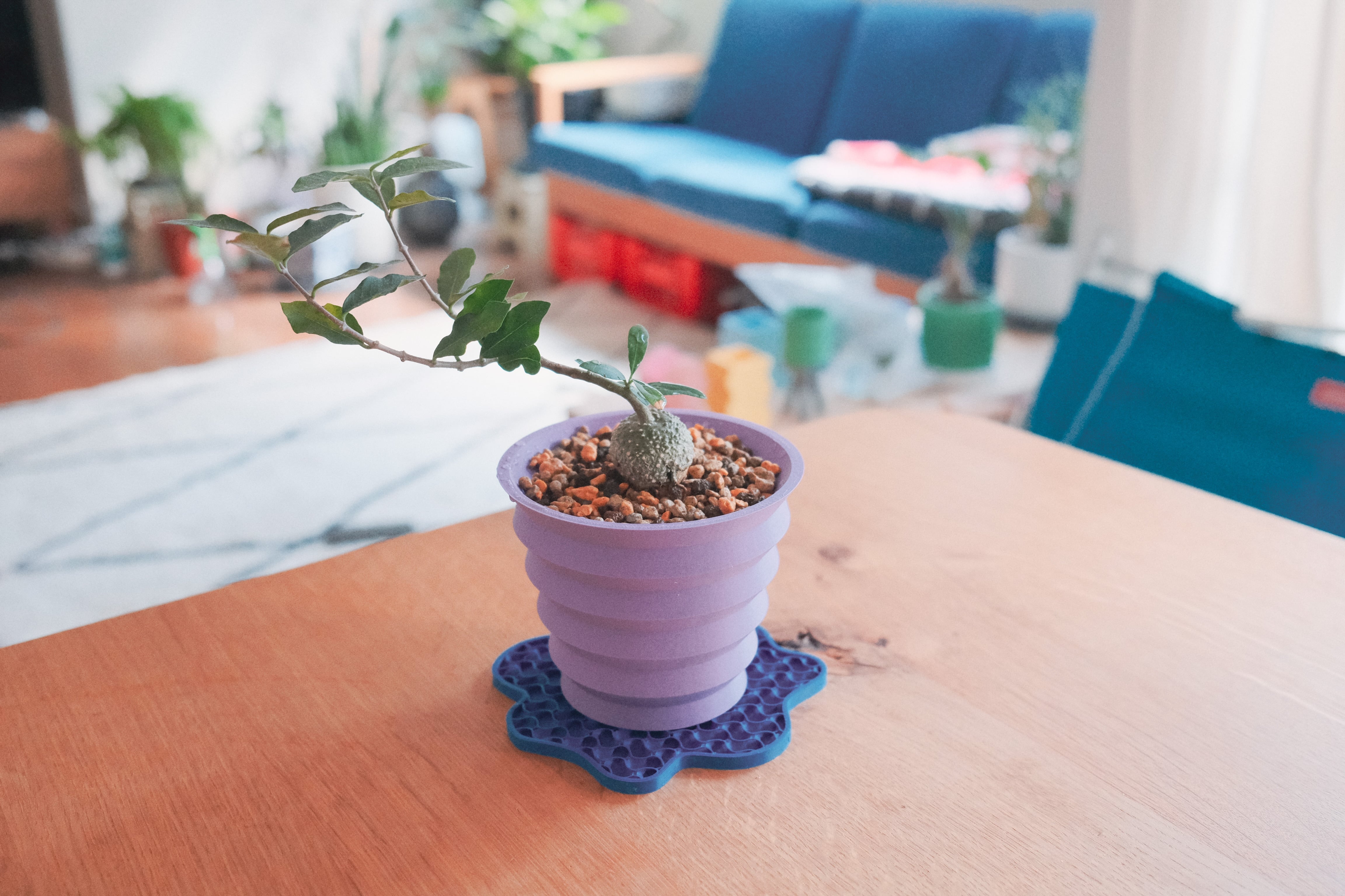 kurva パープル。3Dプリンター製の植木鉢と水たまりをイメージした受け皿のセットです。受け皿は網目状のジャロイド構造になっており通気性と排水性を高めています。